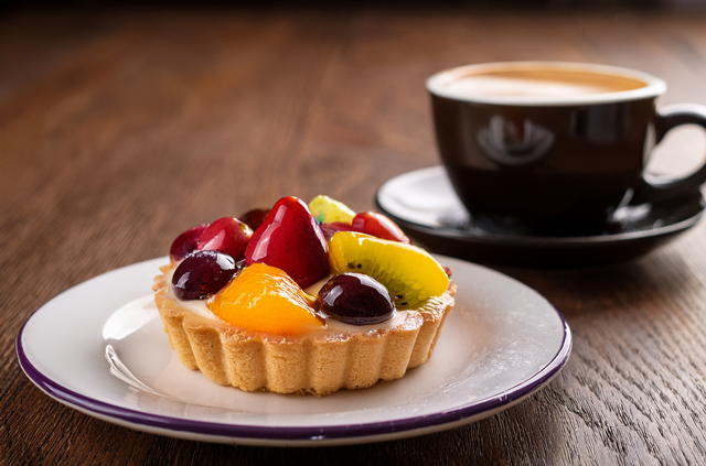 季節を感じて…・季節のフルーツケーキとブレンド珈琲・季節のフルーツをふんだんにのっけたタルトと当店自慢のブレンド珈琲は、よだれもの♡